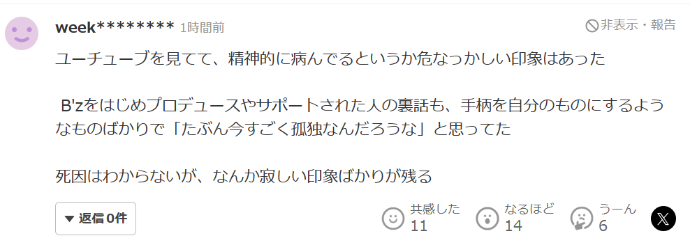突然の訃報に世間では悲しみの声が寄せられています。